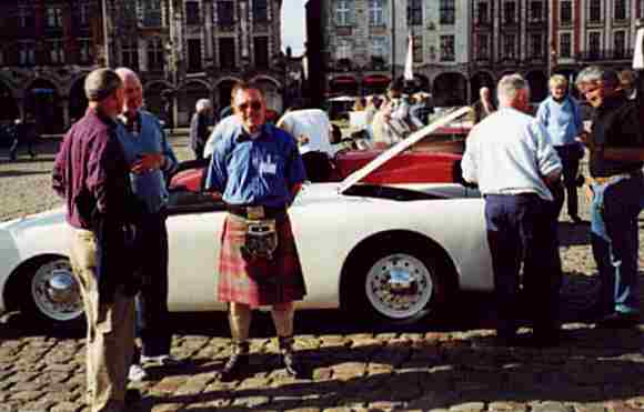 Drummond Black in kilt. Tim Wise in blue top. Car is the Harold Radford special bodied Jupiter. Owner Gordon Cooper in white top with back turned. Only two other special bodied Jupiters made the trip - can you spot one above? Who was its owner?