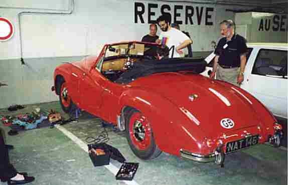 Astonishingly one Jupiter was restored (enough to get it to Le Mans - painted but no bumpers or trim) beginning only in January this year 2000, and was got running, received its MOT and its registration number (it is a USA import) on the day before departure. Well done John Blankley and indeed well done his local Vehicle Registration Office (VRO) too - no petty bureaucracy here. Another Jupiter, chassis 5 and one of the original prototypes, only appeared in the UK one week before departure and it got its MOT, had an engine overhaul and a respray all in 5 days! In its case we needed to get its original 1950 registration plate back and once again Pat Lockyer's local VRO did the business! Civil servants were with us in the good old UK it seems! This was one of three Jupiters in existence before the Le Mans race 50 years ago - truly a 50-year-old Jupiter celebrating its 50th anniversary.